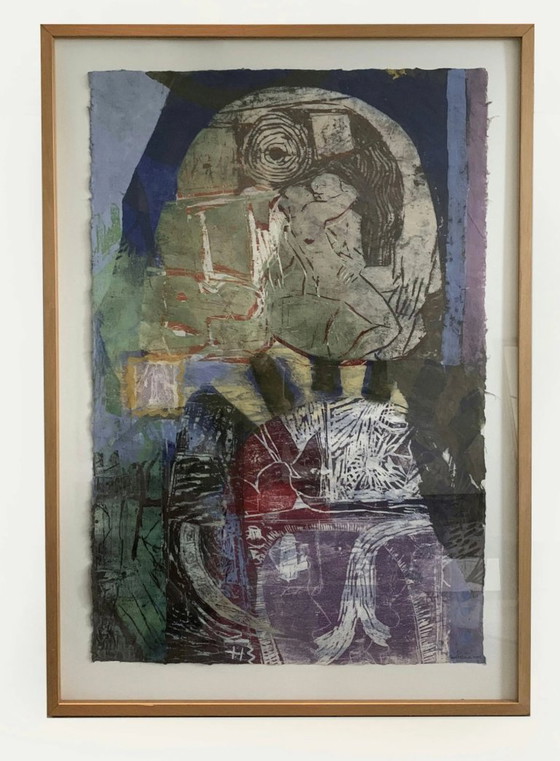 Si tratta di un'opera originale di Daniel TAVENIER (Katwijk 1964) in cornice di legno con vetro, realizzata con tecnica mista su carta fatta a mano. Lo stile è figurativo-astratto, caratterizzato da vivaci colori viola, rosso e verde, e raffigura due figure nude in un intimo bacio all'interno di un'ambientazione stilizzata.