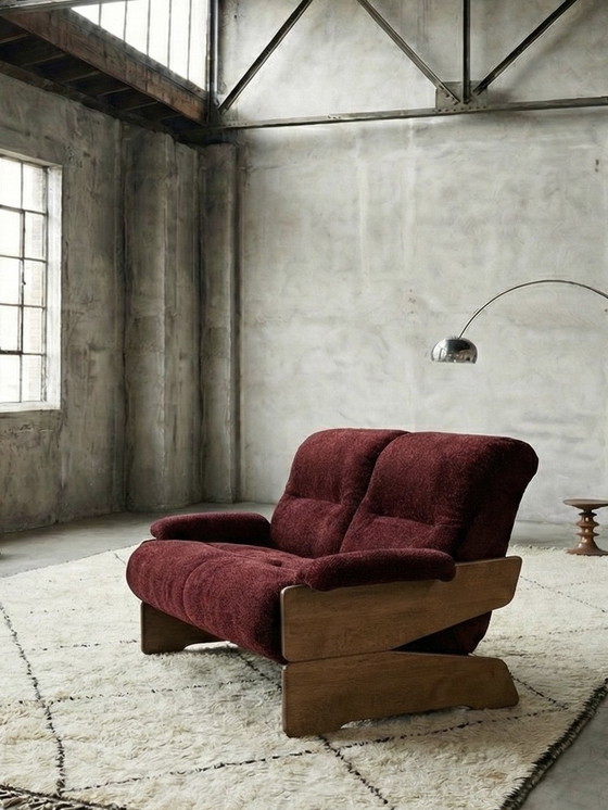 Uno splendido divano a due posti con struttura in rovere e scintillante velluto bordeaux, in un design unico e favoloso degli anni '70.