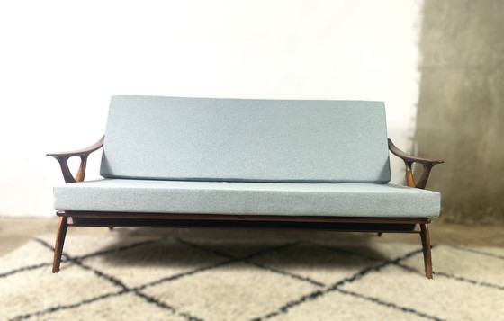 Bellissimo divano a 3 posti progettato e prodotto da De Ster Gelderland nei Paesi Bassi, negli anni Sessanta. La struttura è realizzata in teak massiccio dalla forma organica. Rivestimento nuovo.