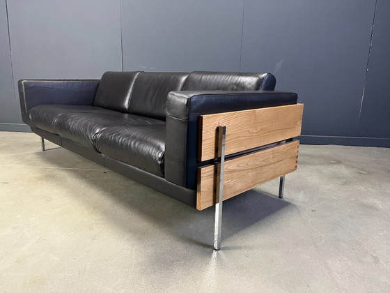 Divano a tre posti 'Forum' in noce e pelle nera, disegnato da Robin Day (1915-2010) per Habitat.
