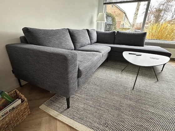 Divano angolare di design, modello Basso, del marchio olandese Hofstede Raanhuis. Ordinato a giugno 2023, in ottime condizioni, senza danni o macchie. Tessuto blu melange con gambe nere. Offerto a causa di un trasloco, per il quale purtroppo abbiamo bisogno di un divano angolare diverso. Questo divano è bellissimo e incredibilmente comodo!
