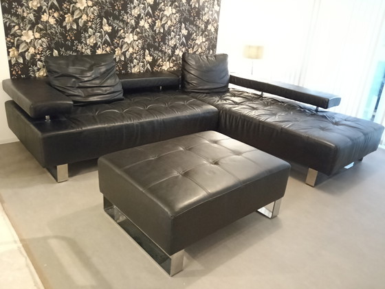 Divano angolare ispirato a Rolf Benz di Montel (Cipriani), di circa 10 anni. La spessa pelle di vacchetta è impeccabile e il divano durerà per anni. Include due cuscini in pelle originali e due cuscini rivestiti con due cuscini poggiareni, mai usati (bellissimo velluto nero spesso). Il divano misura 2,90 x 2,36 x 100 cm (due sezioni). L'altezza della seduta è di 40 cm e, incluso lo schienale, è di 60 cm. Una splendida area salotto con numerose sedute e possibilità di relax. Offre una sensazione di grande spaziosità grazie allo schienale aperto e al poggiapiedi. Gli ampi braccioli sono ideali per appoggiarsi e per essere utilizzati come tavolino. Nota: questo è solo il divano angolare, senza il pouf. Non posso modificare questa informazione nel titolo.