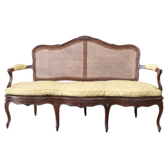 Il divano presenta una solida struttura in noce e una seduta e uno schienale distintivi in paglia viennese. Il suo design è tipico del periodo Luigi XV, con linee fluide che si alternano a raffinate e delicate decorazioni floreali intagliate nel noce. La paglia viennese è interamente intrecciata a mano secondo la tradizione. Un comodo cuscino imbottito, realizzato su misura, che segue la forma della seduta, protegge la paglia viennese e offre maggiore comfort.