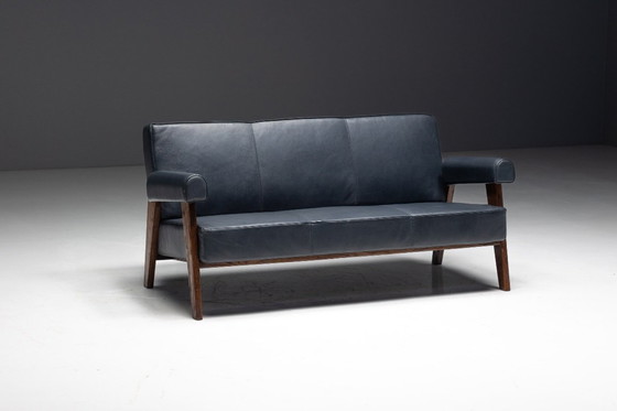 Questo divano Bridge, progettato da Le Corbusier e Pierre Jeanneret per il progetto di Chandigarh negli anni '50, riflette una sintesi di chiarezza architettonica ed espressione scultorea. Concepito all'interno della più ampia visione della pianificazione urbana modernista, il pezzo dimostra un dinamico gioco di volumi ed elementi strutturali, rivelando diverse qualità spaziali a seconda di come la luce interagisce con le sue superfici. La sua forma è al contempo rigorosa ed espressiva, incarnando gli ideali funzionali e la raffinatezza estetica che sono stati al centro del programma di arredo urbano di Chandigarh.