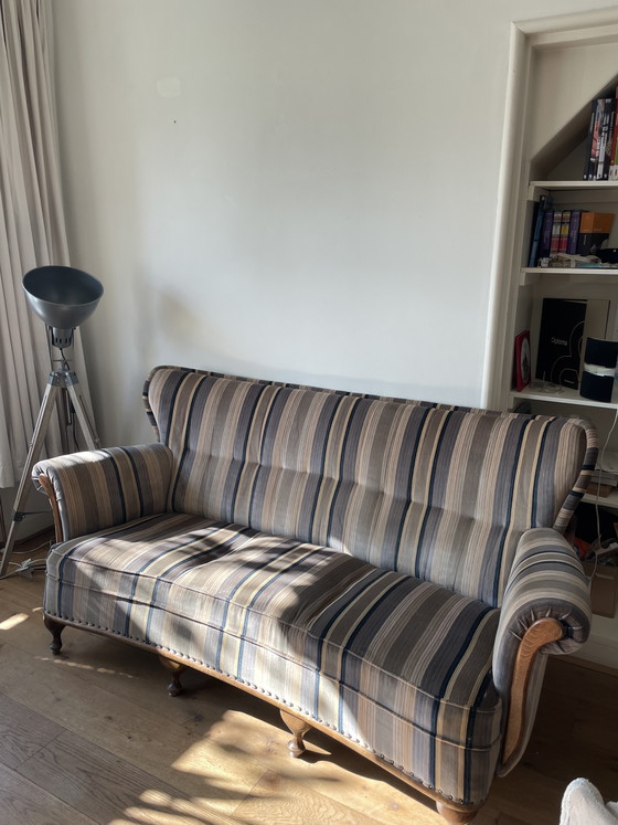 Bellissimo divano con struttura in noce. Il divano è stato recentemente rivestito e quindi ha un aspetto rinnovato.