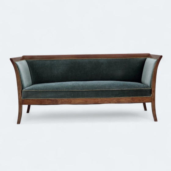 Divano danese a 3 posti, anni '50. Rivestimento in velluto verde/blu, seduta a molle, legno di frassino. Il divano è stato rivestito artigianalmente circa 20 anni fa. Prodotto da un artigiano danese tra il 1950 e il 1955. Design vintage scandinavo originale proveniente direttamente dalla Danimarca. Il divano è stato controllato artigianalmente.
