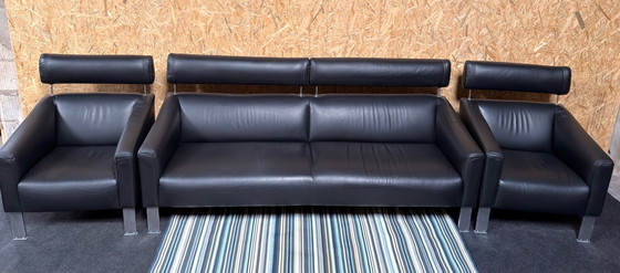 Il set è rivestito in pregiata pelle nera ed è in buone condizioni. Grazie al suo design senza tempo e alle finiture di alta qualità, questo divano si integra perfettamente sia in ambienti moderni che classici.