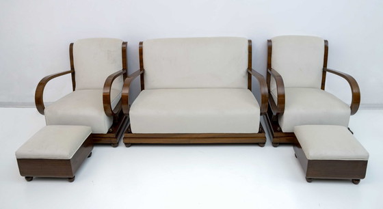 Divano in noce e velluto Art Dèco italiano, due poltrone e ottomani, anni '20