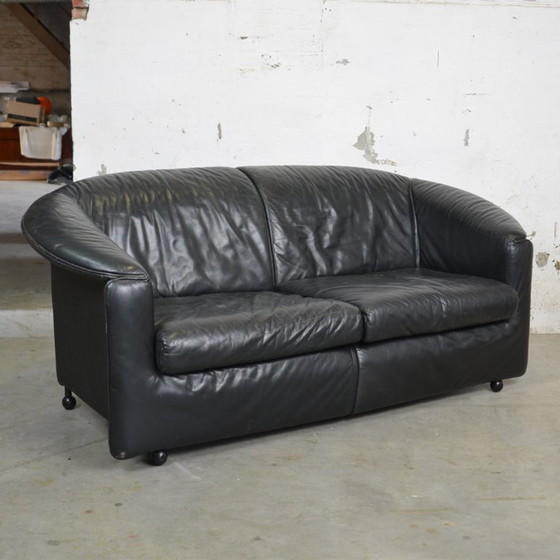 Il divano in pelle Aura di Wittmann, disegnato da Paulo Piva negli anni '80, è un complemento d'arredo senza tempo, adatto a qualsiasi interno. Questo divano a due posti coniuga comfort e design elegante, ed è realizzato in pregiata pelle nera. Perfetto per un soggiorno raffinato.