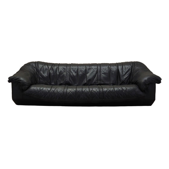 Il divano è stato realizzato negli anni '60, produzione italiana. La struttura era in legno massello. Il divano è conservato nella sua pelle naturale originale di alta qualità, di colore nero. Condizioni: Pelle originale con normali segni di usura. I segni di usura più evidenti sono sempre visibili nelle foto. Prodotto preparato direttamente per l'uso. Dati tecnici: Altezza: 75 cm Larghezza: 244 cm Profondità: 100 cm Altezza seduta: 35 cm Dimensioni seduta: 170 x 55 cm