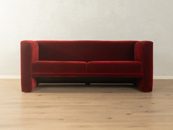 Splendido divano in velluto degli anni '80. Gli ampi pannelli laterali, che arrivano fino a terra, fungono sia da braccioli che da gambe, conferendo al design una precisione geometrica. Un rivestimento in velluto rosso di alta qualità avvolge l'intera struttura e la solida lavorazione artigianale dell'imbottitura garantisce non solo una lunga durata della forma, ma anche un eccellente comfort di seduta. Il pezzo è stato accuratamente pulito e si presenta in ottime condizioni vintage.