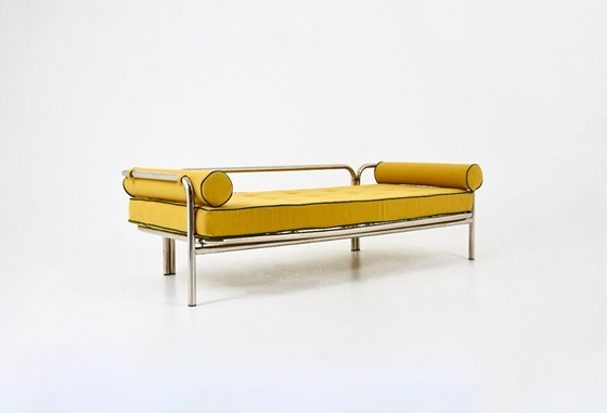 Divano letto a meridiano con cuscino in tessuto giallo con cuciture verdi e struttura in metallo di Gae Aulenti. Modello: Locus Solus. Segni di usura dovuti al tempo e all'età.
