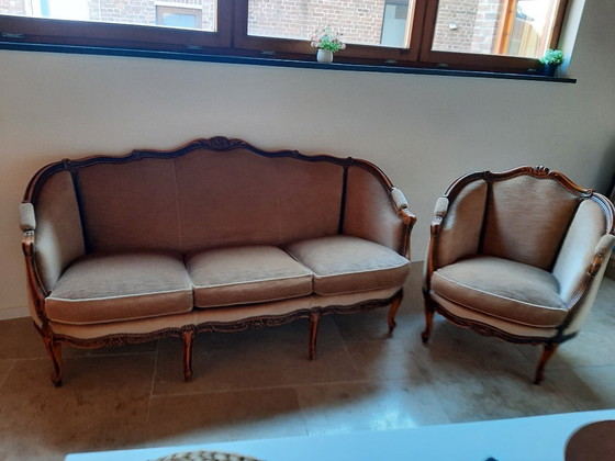 Divano Luigi XV a 3 posti con 2 poltrone. Legno di faggio tinto noce. Rivestimento realizzato a mano: molle interne, lattice, schiuma fredda e materiali di rivestimento di alta qualità. Rivestimento in lino, poi in velluto mohair 100% "Hengelo". Inchiodato a mano con chiodi decorativi.