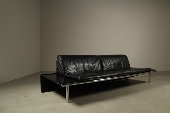 La seduta è composta da cuscini sfoderabili in pelle nera, sorretti frontalmente da sottili gambe in metallo cromato, che conferiscono al divano un aspetto fluttuante. Il contrasto tra il volume massiccio della base e la leggerezza della struttura metallica ne accentua la presenza scultorea.