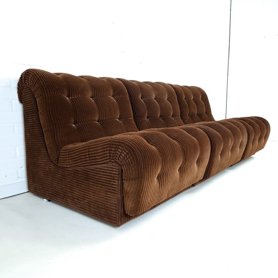 Divano modulare vintage a 3 sezioni, velluto a coste marrone capitonné, anni '70, design moderno di metà secolo