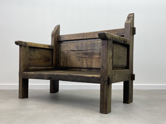Questa panca rustica risale agli inizi del XIX secolo ed è stata realizzata in Spagna con grande precisione e maestria artigianale. È perfetta come seduta in corridoio, per un ingresso rustico o come elemento decorativo scultoreo di grande impatto.