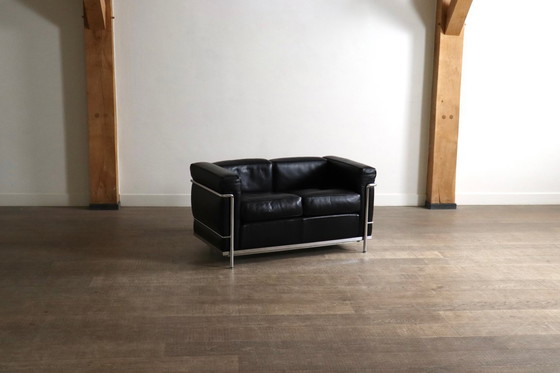 Splendido divano a due posti LC2, un vero classico del design di Le Corbusier, Pierre Jeanneret e Charlotte Perriand, progettato originariamente nel 1928. Questo divano moderno è composto da una struttura tubolare cromata e cuscini in pregiata pelle nera. Questo divano è allo stesso tempo estremamente comodo e dal design iconico. Questo modello in particolare è un esemplare degli anni '90 e ha una splendida patina. Il divano è firmato Cassina e LC2.