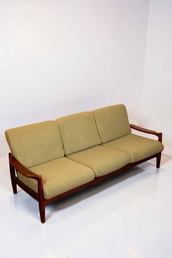 Bellissimo divano vintage a 3 posti proveniente dalla Danimarca, anni '60. Il divano ha una struttura in teak con 6 cuscini sfoderabili. I cuscini sono stati rivestiti con un tessuto bouclé verde muschio. Il divano è ancora molto solido e confortevole e presenta minimi segni d'uso. La struttura è ancora molto robusta.