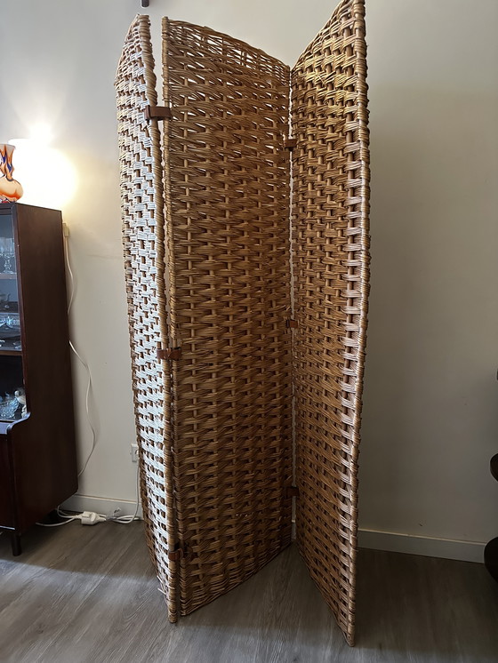 Splendido e ampio divisorio in vimini intrecciato in una calda tonalità naturale. È composto da tre pannelli che si incernierano facilmente con cinghie in pelle. Intreccio fitto, robusto e di buone dimensioni. Ideale per dividere una stanza senza aggiungere ingombro.