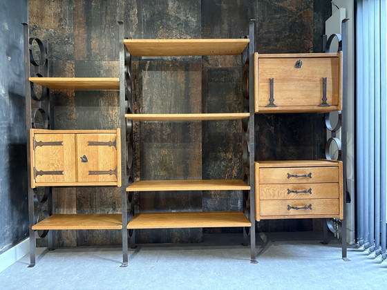 Questo mobile divisorio/parete brutalista di Bram Sprij degli anni '50 è un design fantastico. I montanti in acciaio con anelli creano un effetto giocoso, mentre i robusti ripiani e i mobili in legno massello gli conferiscono un aspetto robusto. È possibile personalizzare la disposizione. Un altro elemento che cattura l'attenzione e che ogni casa merita! Altezza 193 cm, larghezza 256,5 cm, profondità 39 cm.