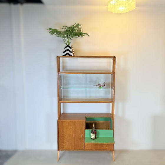 Mobile bar che funge da divisorio, prodotto negli anni '60 dall'ex azienda cecoslovacca Tatra Nábytok. La serie Monti300 è stata progettata da František Jirák. Questo pezzo combina un design senza tempo con la modularità, consentendo di configurarlo completamente a proprio piacimento. Può essere posizionato contro una parete senza comprometterne la funzionalità, oppure al centro di una stanza con accesso da entrambi i lati. Il mobile base presenta una sezione portaoggetti con un ripiano e un'anta a battente su ciascun lato, accanto alla sezione bar con un'anta apribile su entrambi i lati. Questa sezione è anche un'ottima cassettiera porta-giocattoli vintage. Gli elementi superiori sono profondi 30 centimetri e sono costituiti da una vetrina con pannelli scorrevoli in vetro e una libreria modulare. L'intero pezzo è rifinito con impiallacciatura in rovere e laccatura semilucida. Questo pezzo è in buone condizioni vintage. Eventuali dettagli o difetti sono indicati nelle foto o nel testo.