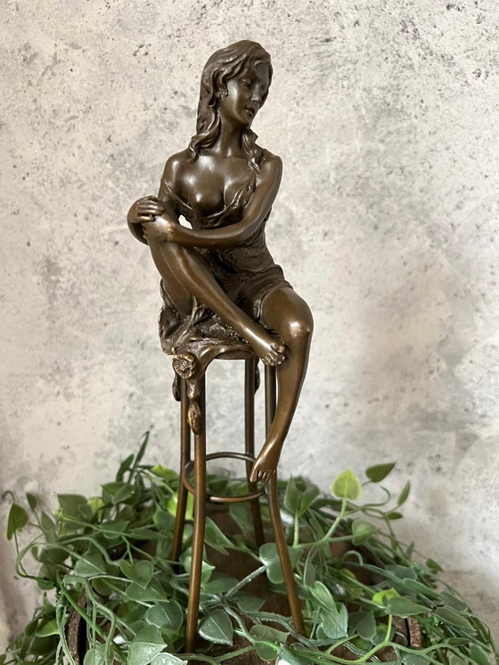 Statua in bronzo di una signora seduta su uno sgabello. Il ginocchio è sollevato e la donna vi appoggia con grazia le mani. Un vero e proprio colpo d'occhio, quest'opera d'arte aggiunge un tocco di eleganza a qualsiasi interno.