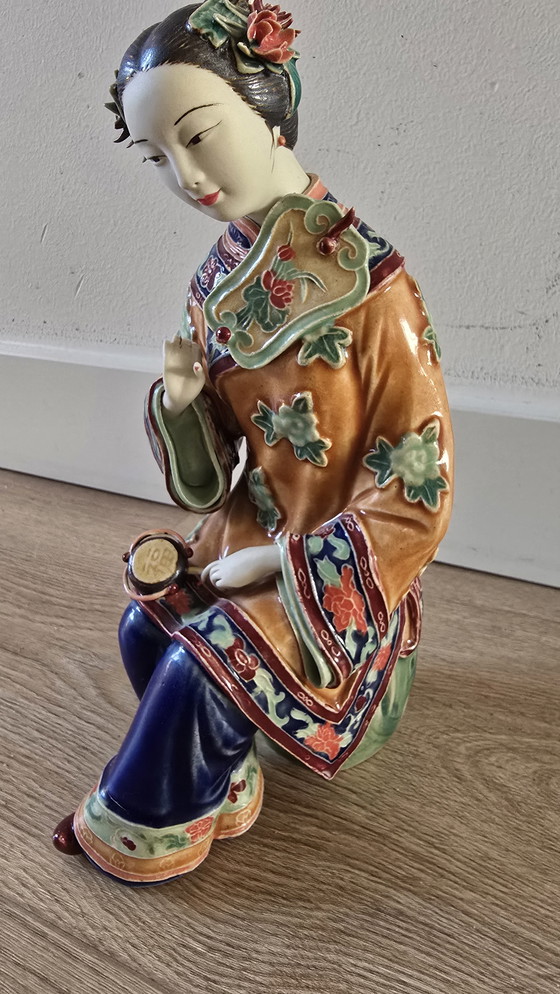 Scopri il fascino di questa splendida statuetta in ceramica cinese Shiwan raffigurante una donna seduta. Con la sua veste colorata e i dettagli raffinati, dona un tocco di eleganza asiatica ai tuoi interni.
