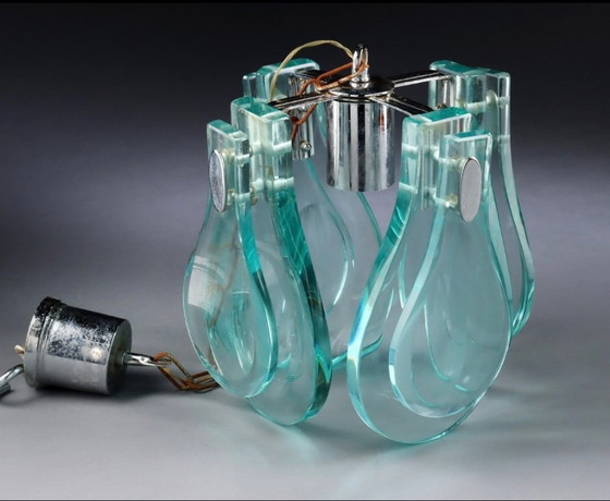 Questa elegante lampada a sospensione di Fontana Arte presenta un design moderno con elementi in vetro turchese e accenti in metallo argentato. La forma unica della lampada e i materiali di alta qualità la rendono un pezzo forte per qualsiasi interno contemporaneo. Il suo design elegante è perfetto per aggiungere un tocco di raffinatezza al vostro spazio.