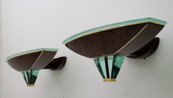 Coppia di lampade da parete attribuite a Fontana Arte, con struttura in metallo effetto radica, vetro spesso e ottone. Sono state prodotte in Italia negli anni '80.