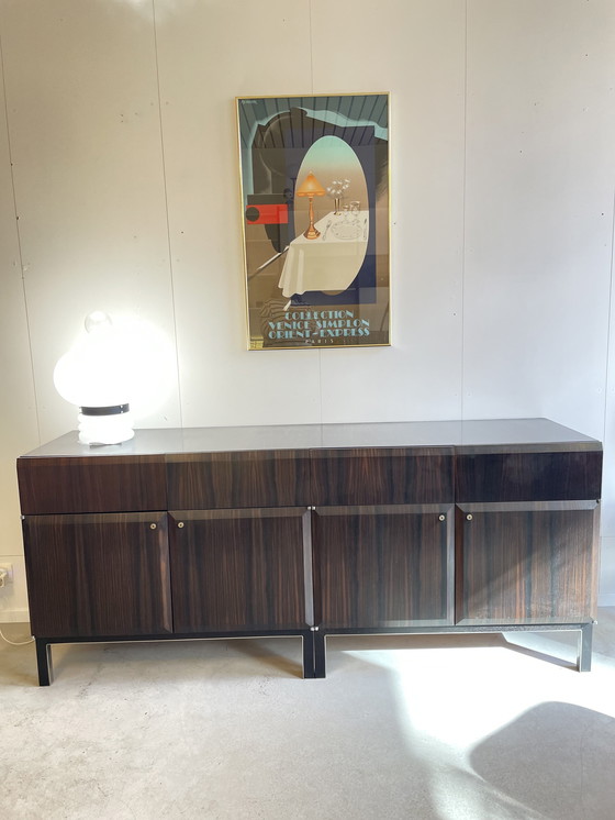 Questa è una splendida credenza brutalista, perfetta per aggiungere un tocco di design audace al tuo spazio. Realizzata in legno di alta qualità con dettagli in metallo, presenta una ricca finitura marrone con sfumature nere. La credenza offre ampio spazio con i suoi ampi scomparti e cassetti, rendendola funzionale ed elegante. Il suo design geometrico e la struttura robusta sono caratteristici dello stile brutalista, garantendo che si distingua come un pezzo unico in qualsiasi stanza.