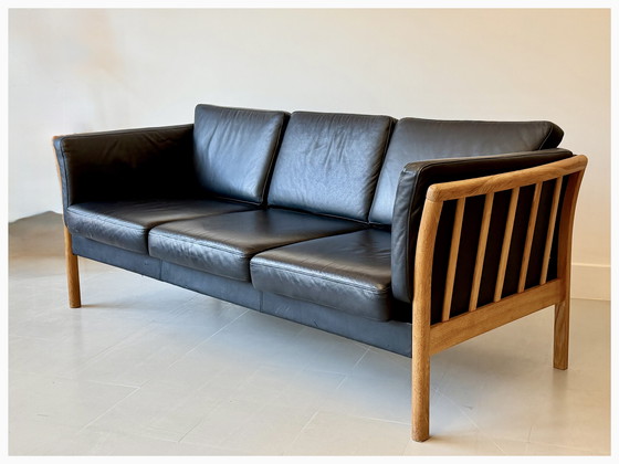Fate un salto indietro nel tempo con questo splendido divano vintage a tre posti realizzato da Stouby in Danimarca negli anni '70. Questo pezzo incarna l'eleganza e la raffinatezza del design di metà secolo, offrendo un perfetto mix di comfort e stile. Il lussuoso rivestimento in pelle nera è completato da una robusta struttura in rovere, che mette in mostra la raffinata artigianalità e l'attenzione ai dettagli tipiche dell'epoca.