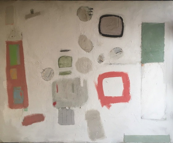 - The artwork features a sophisticated palette of white, green, red, and grey, offering a serene yet dynamic visual experience.