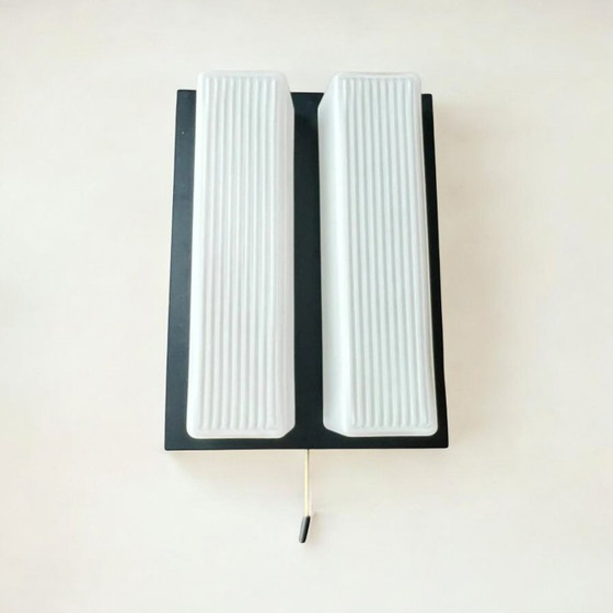 Due lampade da parete di metà secolo con interruttore a tirante o per montaggio diretto. Vetro satinato su corpo metallico dalla