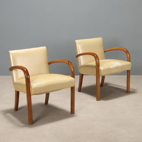 Coppia di poltrone vintage con braccioli a vista in legno di faggio, imbottitura a molle e rivestimento in skai del periodo nei toni dell'ocra. Sedute che si prestano ad essere rinnovata nell'imbottitura e nella tappezzeria scegliendo tra i numerosi tessuti presenti nei nostri magazzini.