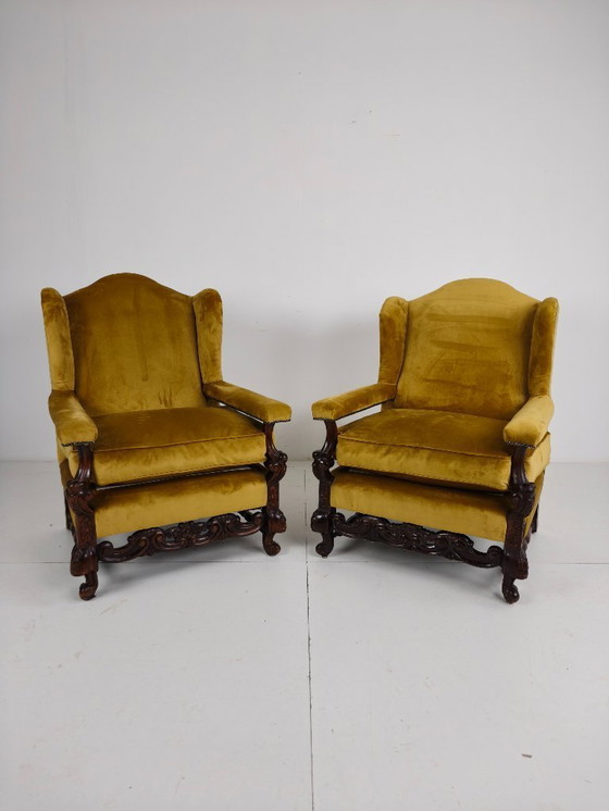 Due poltrone in noce del XIX secolo con rivestimento in velluto