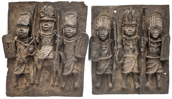 Lotto di due grandi placche reali in bronzo. Origine Nigeria – Benin. 1 – Altezza: 57 cm – Larghezza: 47 cm – Peso: 15 kg 2 – Altezza: 53 cm – Larghezza: 46 cm – Peso: 14 kg Circa 1930