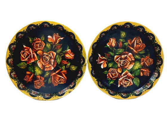 Fate un salto indietro nel tempo con questa squisita coppia di vassoi da portata vintage in latta, ognuno decorato con un accattivante motivo floreale. Le intense tonalità di giallo e nero creano uno sfondo suggestivo per gli intricati motivi a rose, rendendo questi vassoi un'aggiunta perfetta a qualsiasi arredamento d'ispirazione vintage.