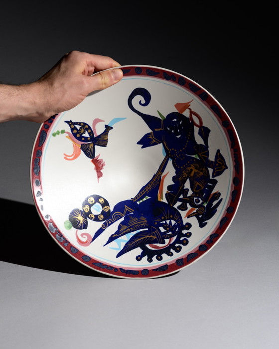Realizzato in porcellana opaca con una superficie leggera e setosa, il piatto presenta il mondo visivo distintivo di Portanier: energici blu cobalto, rossi accesi, accenti dorati, turchese, verde e gesti figurativi astratti.