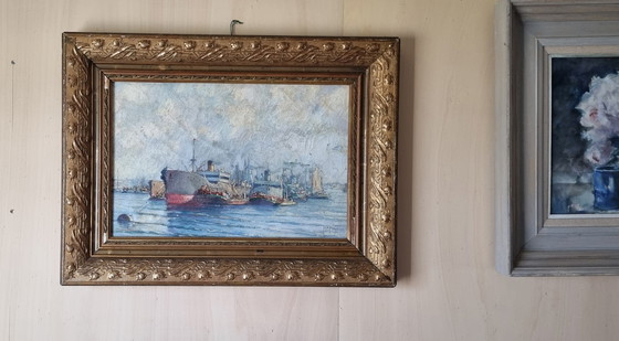 Antico dipinto olandese firmato raffigurante una scena portuale, in una pesante cornice in legno color oro.