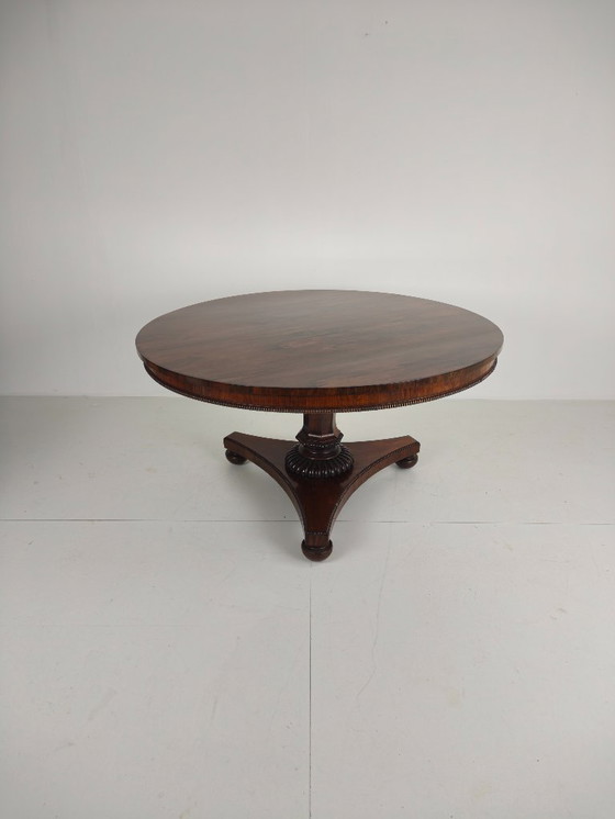Un tavolo da colazione in palissandro splendidamente lavorato, risalente a Guglielmo IV, circa 1820. Questo elegante tavolo basculante presenta un piano in palissandro riccamente decorato e una base centrale con gambe a forma di sfera e ruote in ottone.