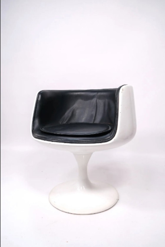 Poltrona Eero AARNIO "Cognac", scocca in fibra di vetro bianca, gambe a tulipano, seduta in pelle nera