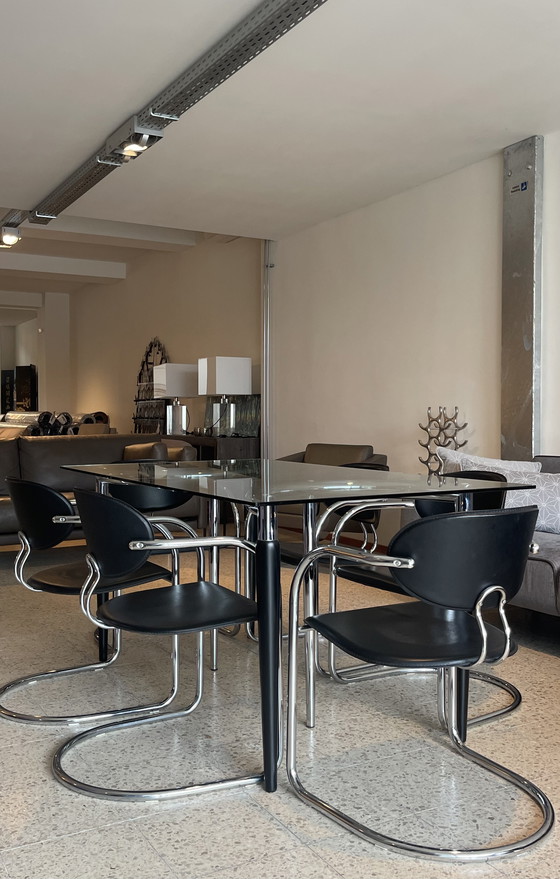 CondizioneMolto buonoColoriNeroMaterialeCromo, Vetro, PelleNumero di articoli6Altezza76 cmLarghezza54 cmProfondità52 cmAltezza del sedile43 cmSegni di utilizzoMacchie, Graffi