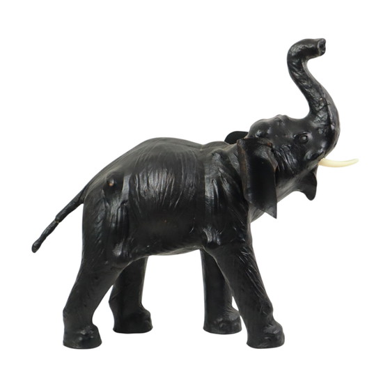 Grande elefante vintage, rara scultura di queste dimensioni, realizzata in cartapesta e rivestita in pelle nera, l'elefante ha zanne in plastica bianca e occhi in plastica, completamente nello stile di Omersa di Liberty of London, circa anni 1970-80. Banana in scala!