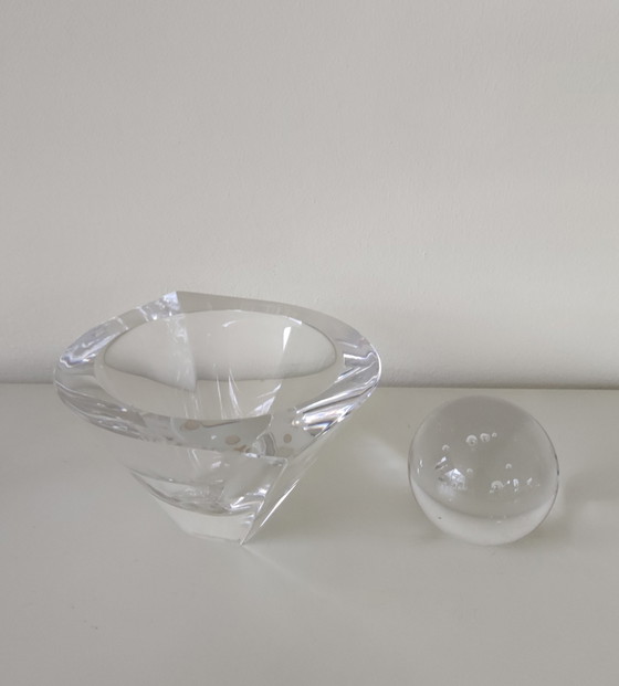 Elegante ciotola decorativa Orrefors Marin in cristallo di alta qualità, con sfera coordinata. Spessa e pesante, quasi 3 chili. Nessun danno. La sfera solida con bolle d'aria, di 8 cm di diametro, si inserisce all'interno della ciotola. Può essere utilizzata anche come portacandele. Design svedese degli anni '70 del designer Jan Johansson. Firmata a mano. Questo set emana raffinatezza ed è uno splendido esempio di design Art Déco. Perfetto per aggiungere un tocco di lusso a qualsiasi interno.