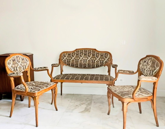 Immergetevi nell'eleganza senza tempo di questo salotto in stile Liberty, un autentico tributo all'arte e alla raffinatezza del passato. Questo set, composto da un divano e due poltrone, è caratterizzato da una struttura in legno finemente lavorata che esalta le linee sinuose e armoniose tipiche del periodo Liberty. La tappezzeria, ricca di motivi floreali, aggiunge un tocco di sofisticata bellezza, rendendo questo salotto un pezzo ideale per chi desidera arricchire il proprio spazio con un tocco di storia e stile.
