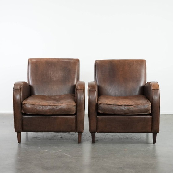 Un set elegante che si adatta perfettamente sia agli interni classici che a quelli moderni dello spazio che avete scelto. Questo elegante set di due poltrone è realizzato in pelle di pecora e presenta un design raffinato con splendide forme arrotondate. Sono rifinite con profili in tinta, che contribuiscono a un look senza tempo ma lussuoso. Le poltrone sono dotate di cuscini di seduta removibili e offrono una seduta confortevole. Anni di utilizzo responsabile hanno mostrato alcuni segni di usura. Strutturalmente, sono in buone condizioni, pronte all'uso e, con la dovuta cura, questo set vi garantirà anni di piacere!