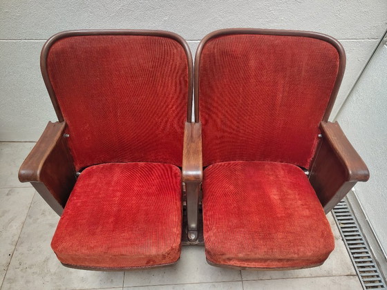Vendo queste due poltrone da cinema vintage restaurate (esclusa la tappezzeria) dall'aspetto unico! Le poltrone hanno un rivestimento in velluto a coste rosso e una struttura in legno e sono perfette per un home theater, una sala giochi o come elemento decorativo per i vostri interni. Sono dotate di un meccanismo pieghevole, che le rende funzionali ed eleganti. Sono montate su due assi di legno.