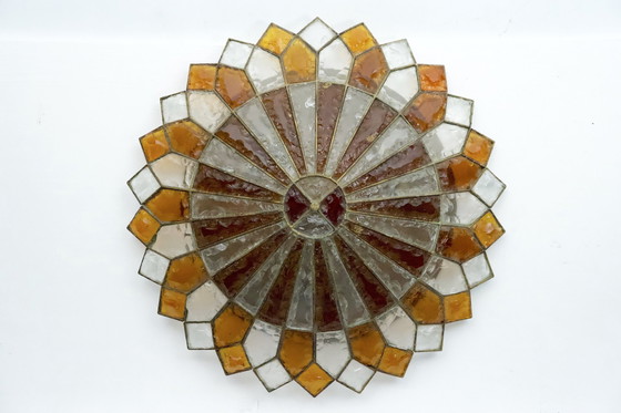 Questa grande lampada da soffitto rotonda può essere utilizzata sia come lampada da soffitto che da parete. Realizzata in spesso vetro di Murano e prodotta da Poliarte a Verona, Italia, intorno al 1970, si presenta in ottime condizioni vintage, con lievi segni del tempo e dell'usura. La lampada presenta segmenti geometrici di vetro trasparente e colorato, scheggiato a mano, alternati nei colori ambra, rosso e arancione, incastonati in una struttura in ferro forgiato a mano. Perfettamente funzionante secondo gli standard UE, adattabile su richiesta anche agli standard USA.