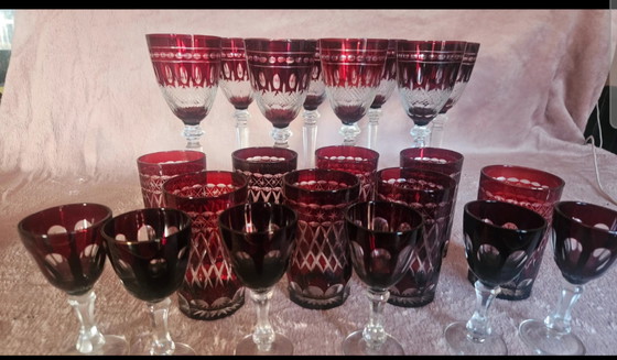 Un meraviglioso ed elegante set vintage proveniente dalla Boemia/Repubblica Ceca, realizzato in cristallo rosso rubino intenso, taglio a cristallo trasparente.