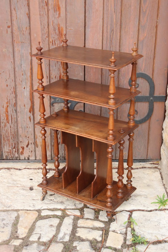Découvrez cette élégante étagère sur pieds datant du début du XXème siècle, une pièce de mobilier qui incarne le charme et le savoir-faire du travail de bois tourné de son époque. Elle apportera une touche d'authenticité à votre intérieur. Très belle état général, 4 petites roulettes présentes et parfaitement fonctionnelles.